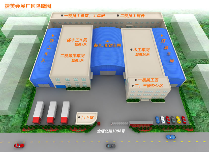 捷美工廠位于上海市奉賢區(qū)金閘路1088號(hào),位于上海國(guó)家會(huì)展中心及上海新國(guó)際博覽中心中間位置距各大型展館僅需45分鐘車程.工廠占地8000平米,整體區(qū)分為辦公區(qū);展覽制作車間;道具制作車間;鐵藝車間;美 工車間;倉(cāng)儲(chǔ)庫(kù)房;宿舍樓以及食堂.